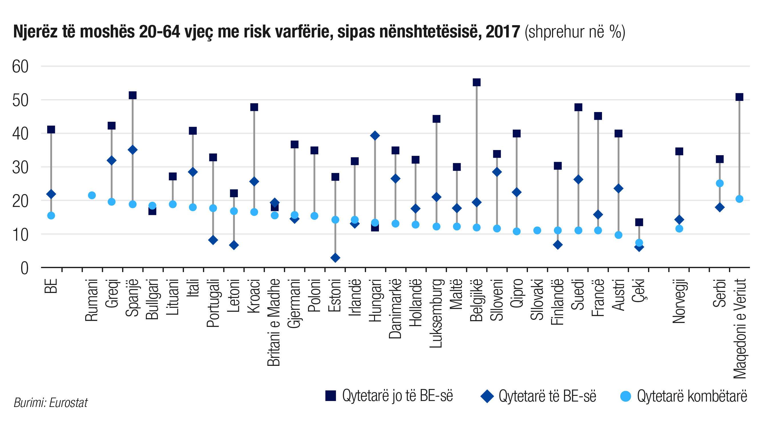 Mes vendeve anëtare të BE-së (sipas të dhënave të disponueshme të Eurostat), niveli i rrezikut të varfërisë së regjistruar për shtetasit që nuk janë pjesë e BE-së, por që jetonin në vendet anëtare ishte më i larti (55.5 %) në Belgjikë, ndjekur nga Spanja (51.5 %), Kroacia (47.9 %), Suedia (47.7 %) dhe Franca (45.3 %).