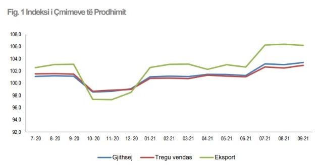 Indeksi i Çmimeve të Prodhimit të produkteve për tregun vendas, krahasuar me tremujorin e tretë të vitit 2020, shënoi rritje me 3.3%. Rritjen më të madhe sipas Instat e ka industria nxjerrëse me 8.5%.