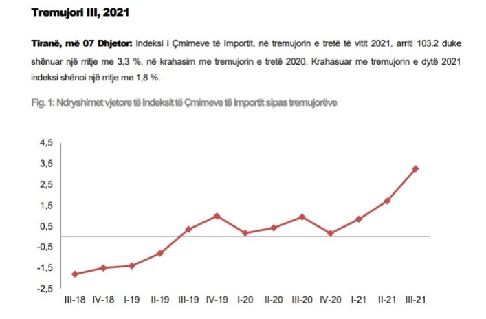 Indeksi i Çmimeve të Importit, në tremujorin e tretë të vitit 2021, arriti 103.2 duke shënuar një rritje me 3.3 %, në krahasim me tremujorin e tretë 2020. Nga tremujori i dytë rritja raportohet 1.8%.