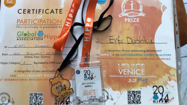Erti fillimisht u shpall fitues i fazës së dytë në Olimpiadën e Gjuhës Angleze në HIPPO dhe më pas konkurroi për fitore në fazën finale të organizuar në Venecia.