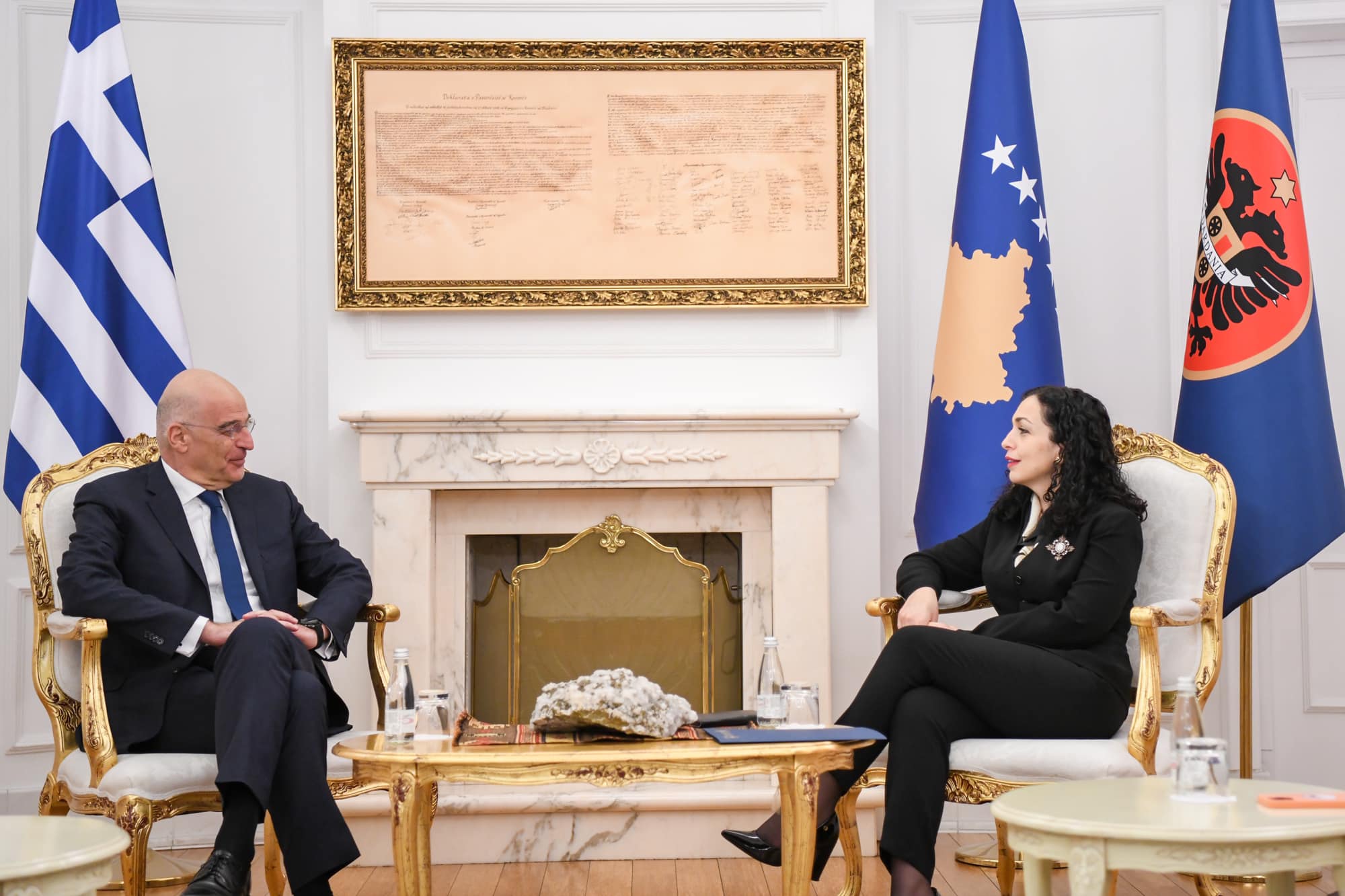 Presidentja e Kosovës, Vjosa Osmani, në një takim ministrin e Punëve të Jashtme të Greqisë, Nikos Dendias. Greqia nuk e njeh Kosovën