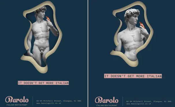 Billbordi ishte për të promovuar restorantin italian Barolo, që i përket grupit Drg, i cili ndodhet në qendër të Glasgow. Imazhi i Davidit të Michelanxhelo nuk plotësonte parametrat strikte të vendosura nga agjencia Globale, përgjegjëse për hapësirat reklamuese dhe cilësohej shumë lakuriq. Grupi Drg tha se fillimisht nuk po e kuptonte se pse po ndalohej reklama që tregonte skulpturën me një fetë pica dhe fjalët “nuk ka asgjë më italiane” dhe më pas u përpoq për të gjetur një zgjidhje.