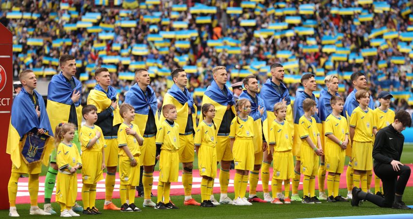 Gjatë ekzekutimit të himnit para ndeshjes në ‘Wembley’ pati emocione të forta. Ukrainasit zbritën në fushë me flamurin e tyre mbi shpatulla. Pastaj 22 lojtarët e dy skuadrave u përzjenë mes tyre për foton e rastit, duke vendosur në plan të parë flamurin me mbishkrimin “Peace” (Paqe).