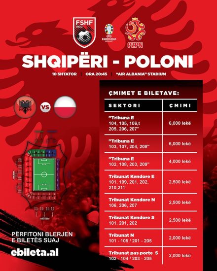 Sigurisht, në krahasim me ndeshjen e fundit me Moldavinë, ku Kombëtarja jonë fitoi 2-0, ka një rritje të çmimeve. Bileta më e lirë ndaj Polonisë kushton 2000 lekë, kurse më e shtrenjta 6000 lekë.