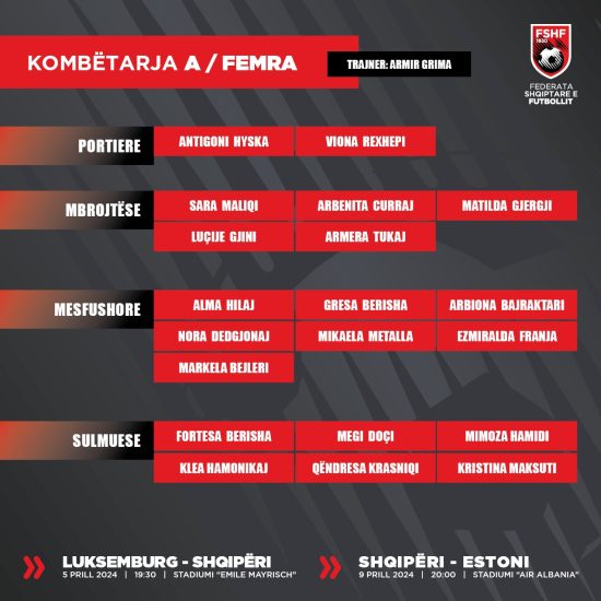 Gazeta Si – Trajneri i Kombëtares së futbollit të femrave, Armir Grima, ka shpallur sot listën me 20 lojtaret e grumbulluara për kualifikueset e Europianit ‘Zvicër 2025’. Shqipëria bën pjesë në Grupit C5, bashkë me Estoninë dhe Luksemburgun, dhe synon kalimin në Play-off.
