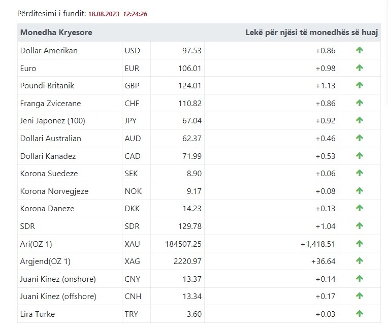 Dollari Amerikan këmbehet sot me 97.53 lekë, duke prekur nivelin më të lartë që nga fillimi i muajit korrik. Ndërsa Paundi Britanik arriti vlerën e 124.01 lekëve, niveli më i lartë që prej fundit të muajit qershor.