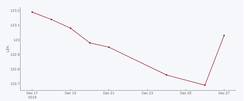 Sipas kursit zyrtar të Bankës së Shqipërisë një euro është shkëmbyer ditën e enjte me 123,03 lekë me një rritje prej 0,34 pikë nga një ditë më parë.