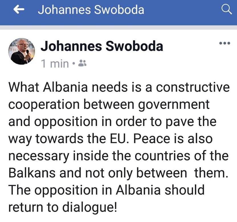 “Ajo çfarë Shqipëria ka nevojë është një bashkëpunim konstruktiv ndërmjet qeverisë dhe opozitës në mënyrë që të shtrojë rrugën drejt BE-së. Gjithashtu paqja është e rëndësishme renda shteteve të Ballkani dhe jo vetëm mes tyre. Opozita në Shqipëri duhet që ti rikthehet dialogut”, ishte mesazhi i Swoboda-s.
