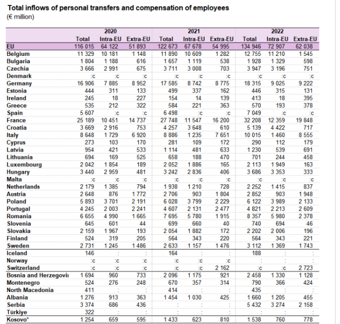 Në vlerë, emigrantët shqiptari sollën në atdhe 1.2 mld euro gjatë 2022-shit, rreth 6% më shumë se 2021-shi. Vlera e raportuar nga Eurostat u referohet remitancave të matura si dërgesa apo transferta personale dhe të ardhurave të punonjësve nga puna jashtë vendit. Punësimi jashtë vendit përfshin punësimin sezonal, atë afatshkurtër si dhe të ardhurat e punonjësve ndërkufitarë apo në distancë.