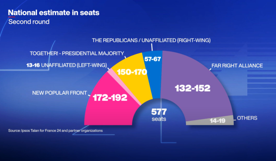 Në vend të dytë vjen Aleanca e Ansamblit e Emannuel Macron me deri në 170 vende. Tubimi Kombëtar nuk pritet të marrë më tepër se 140 vende.