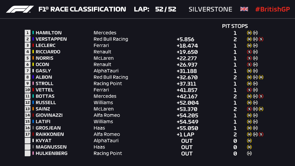 Spanjolli i McLaren fatkeqësisht del jashtë zonës së pikëve, po ashtu si Bottas, por Hamilton bën mrekullinë dhe e çon makinën me 3 goma në finish duke e fituar garën. Frika nga problemi i gomave, bëri që Red Bull të thërrasë Verstappen në pit-stop për ti ndërruar ato. Por ky moment i kushtoi fitoren, sepse po te mos ishte futur ne boxe, ai do e kishte arritur Hamilton dhe do ta kishte parakaluar gjate kohës që ai po xhironte me 3 goma.