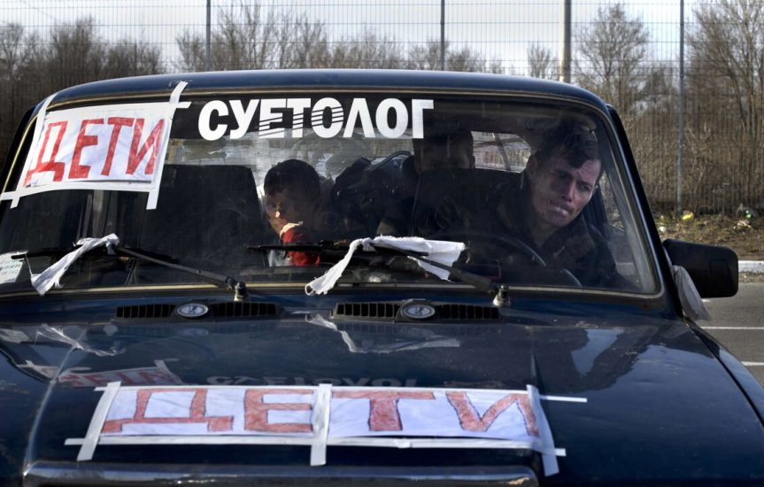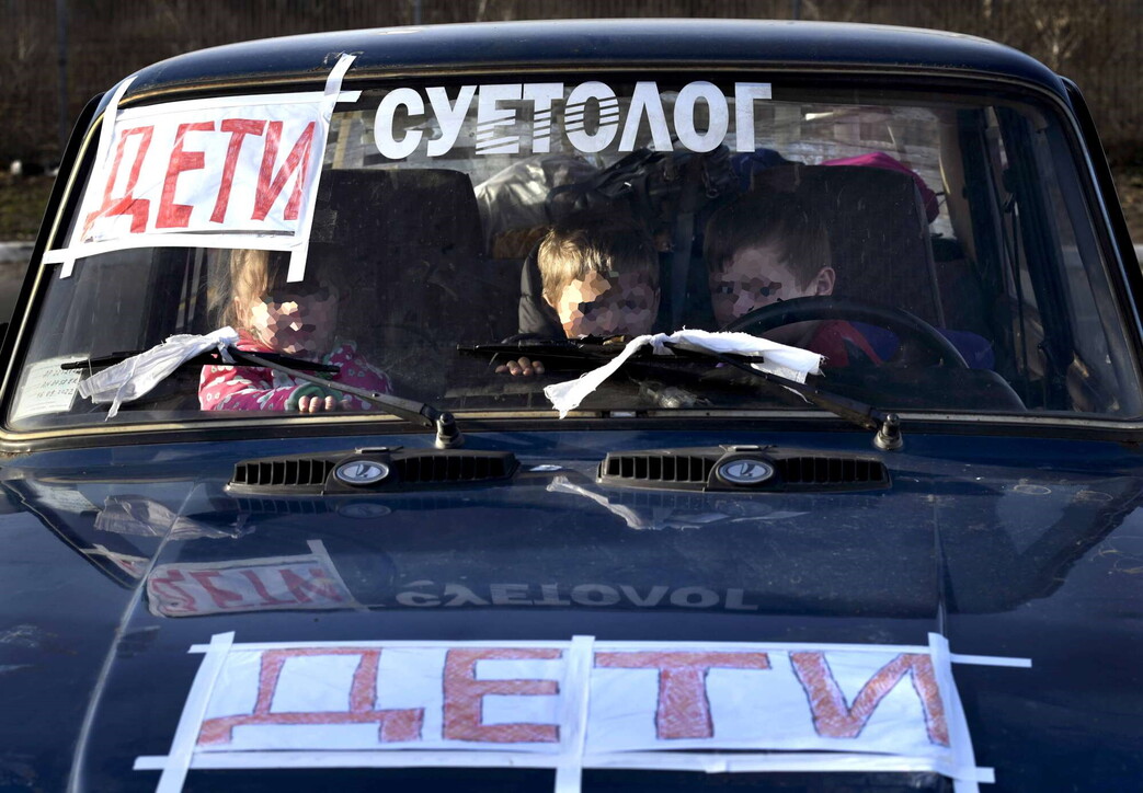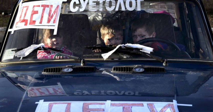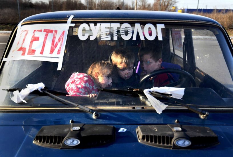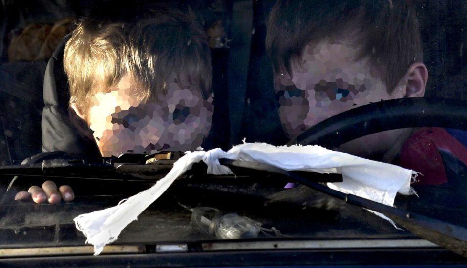 Për të mos u goditur nga bombat apo raketat ruse, babai, nëna dhe tre fëmijët vendosën në çdo cep të automjetit shami të bardha dhe në xhamin e përparmë dhe në kofano fjalët: “дети”, “fëmijë”.
