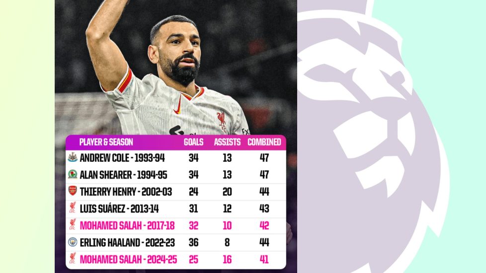 Mohamed Salah po zhvillonin një sezon të befasueshëm në Premier League por sa rekorde do të jetë në gjëndje të thyejë ai deri në fund të 2024-25. Më pasigurinë për të ardhmen te Liverpool dhe potencialisht largimin nga “Anfield” në merkaton e verës, Mohamed Salah mund të jetë duke luajtur të fundit sezon në Premier League. Nëse do të jetë kështu, ai duket se ka ruajtur më të mirën e tij për lamtumirën. Me golin dhe asistin në fitoren e Liverpool 2-0 ndaj Manchester City-t në transfertë, Salah arriti në kuotën e 41 golave dhe asistëve në Premier League 2024-25. Ai u bë në këtë mënyrë i vetmi lojtar që arrin të përfshihet në 40+ në dy sezone në historinë e Premier League