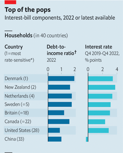 Sa më shumë të hyjë në borxhe bota, aq më e brishtë bëhet ndaj normave të interesit. Për të vlerësuar efektin e kombinuar të huamarrjes dhe normave më të larta, The Economist ka vlerësuar faturën e interesave për firmat, familjet dhe qeveritë në 58 vende. Së bashku këto ekonomi përbëjnë më shumë se 90% të PBB-së globale. Në vitin 2021, fatura e tyre e interesit ishte 10.4 trilion dollarë, ose 12% e PBB-së së kombinuar. Deri në vitin 2022 ajo kishte arritur një 13 trilion dollarë, ose 14.5% të PBB-së.