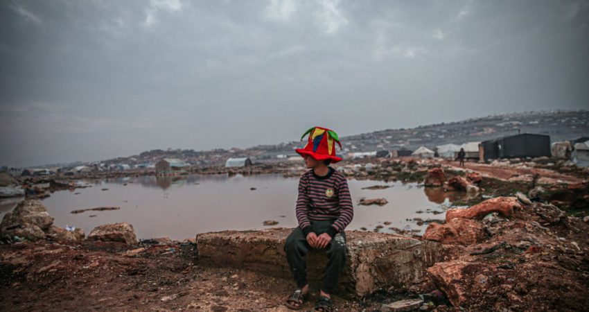 Një fëmijë në një kamp refugjatësh ne Siri është ulur jashtë një dyqani lodrash, rrethuar me ndërtesa të shkatërruara ku as kapelja me ngjyra në kokë nuk i jep buzëqeshjen në fytyrë.\The Guardian