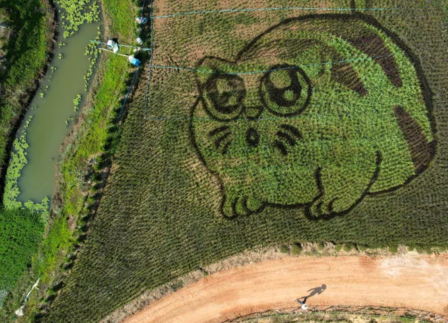Fermeri Tanyapong Jaikham dhe një ekip punëtorësh mbollën orizin në pika të ndryshme në fushë në provincën veriore të Chiang Rai për të përshkruar macet, duke shpresuar të joshin turistët dhe njerëzit që i duan kafshët shtëpiake.