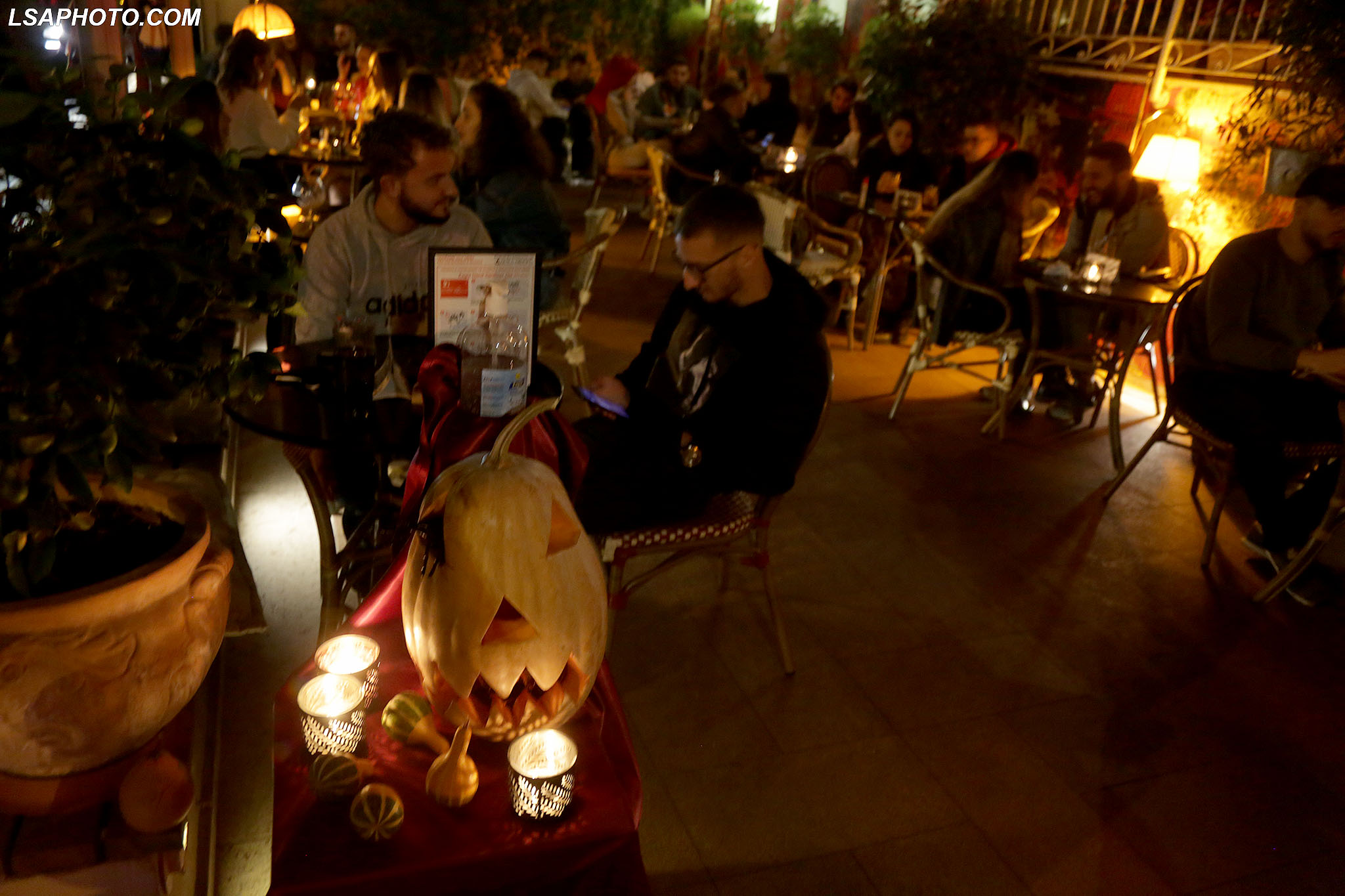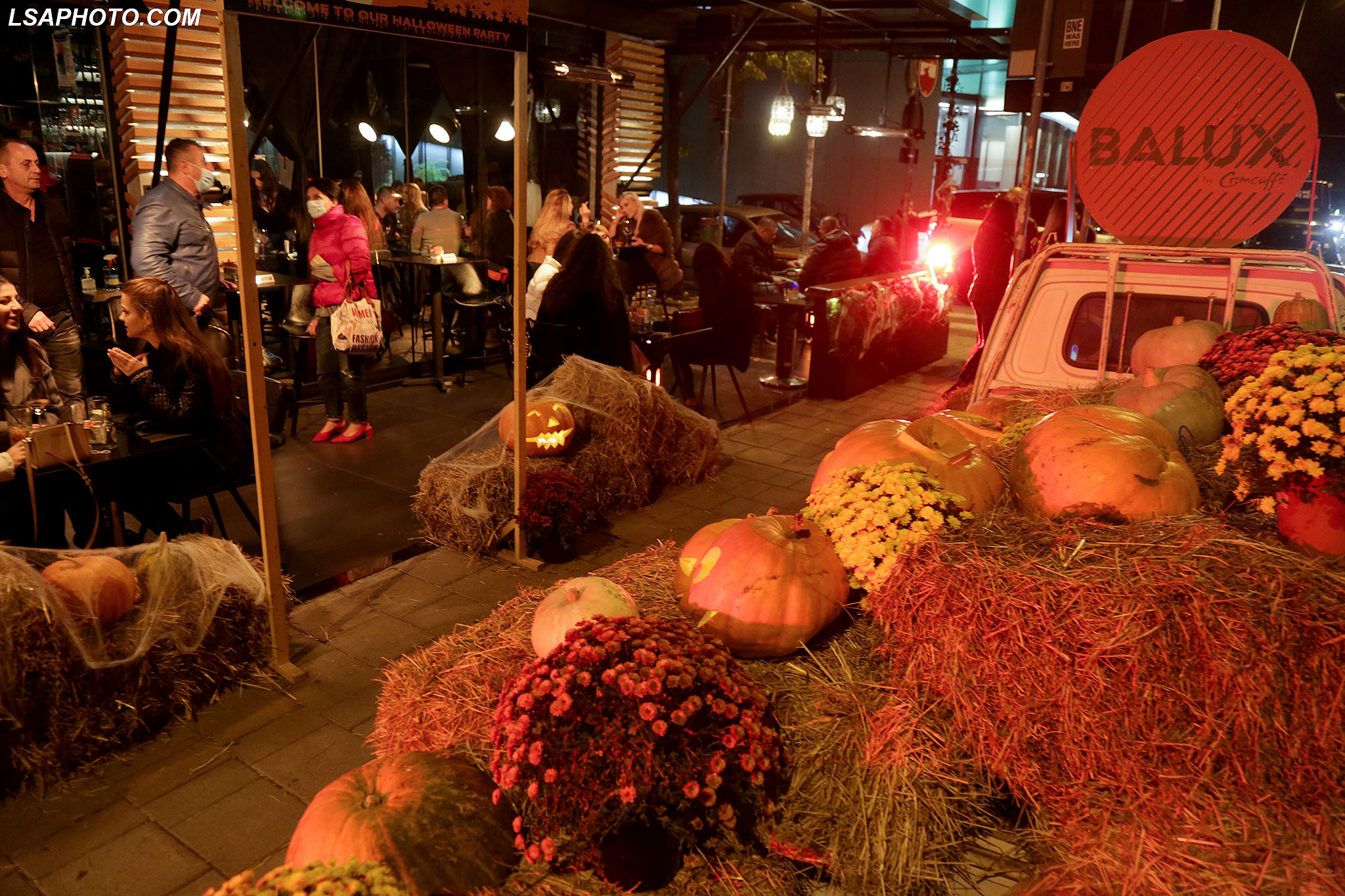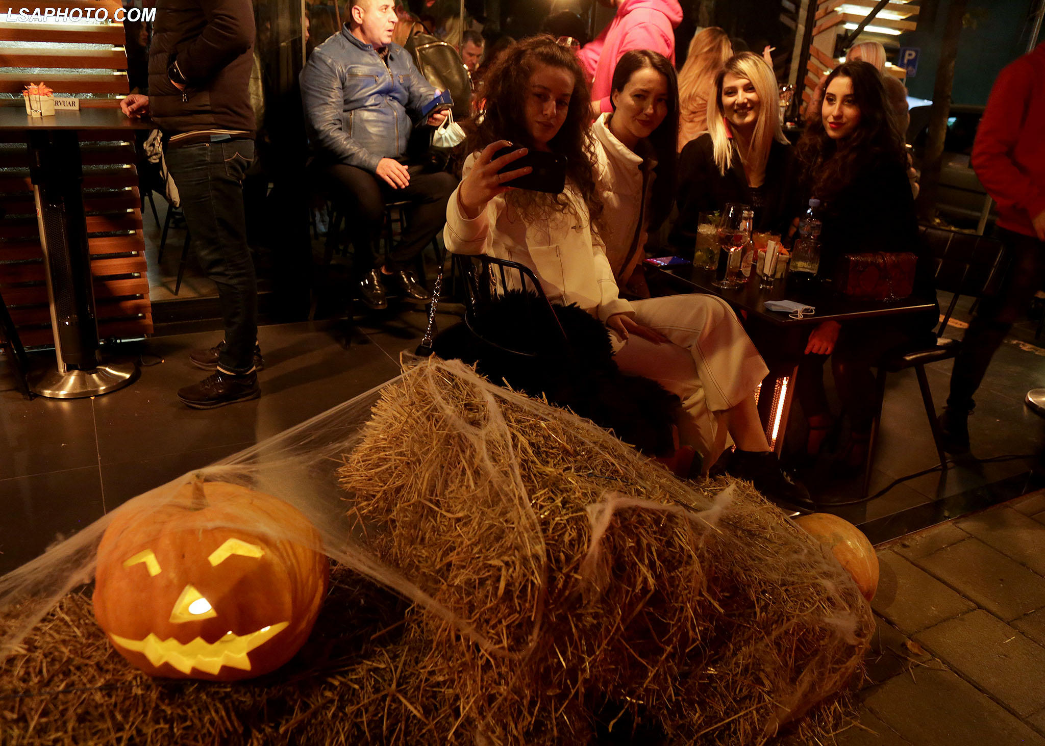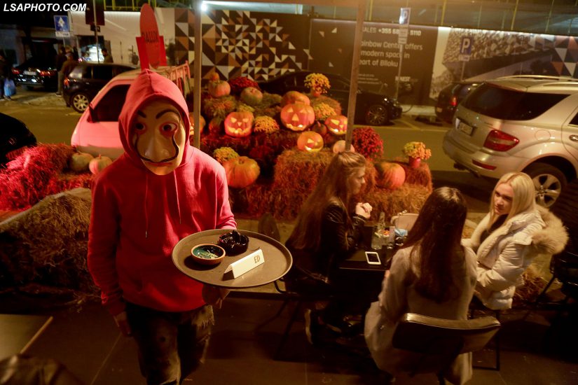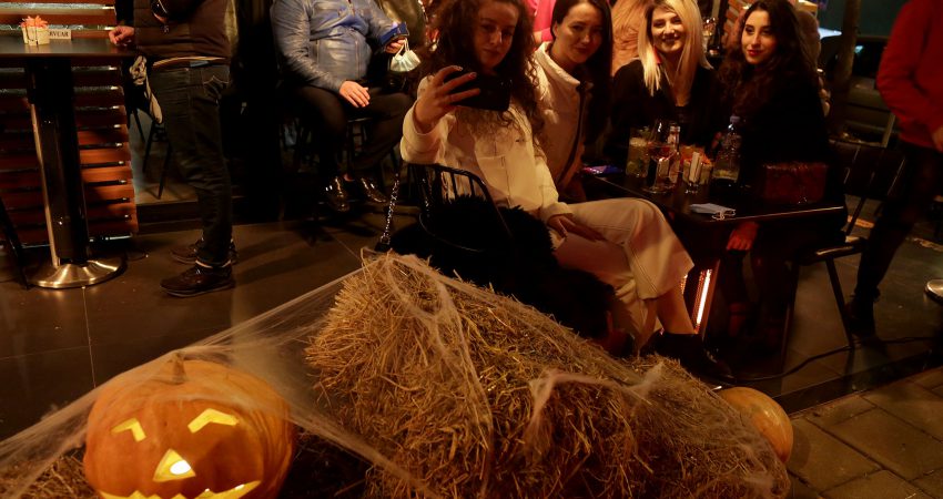 Të rinj me maska të pikturuara në fytyrë gjatë festimeve me rastin e festës së Halloëeen, në një nga lokalet e Tiranës. Ndërkohë, policia ka marrë masa për të mos lejuar organizimet dhe grumbullimet për festën, për shkak të pandemisë së koronavirusit.