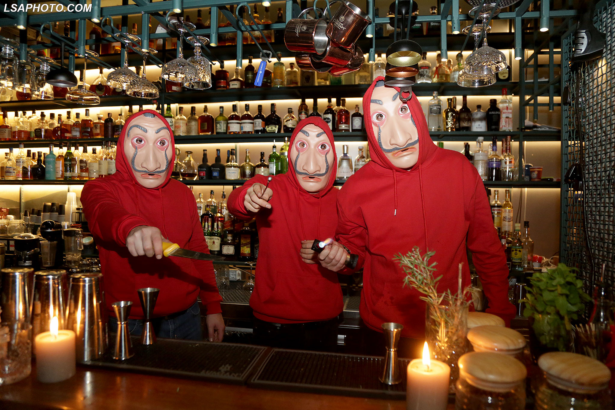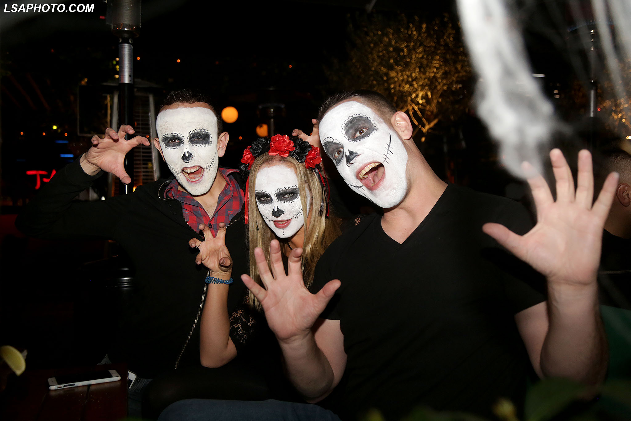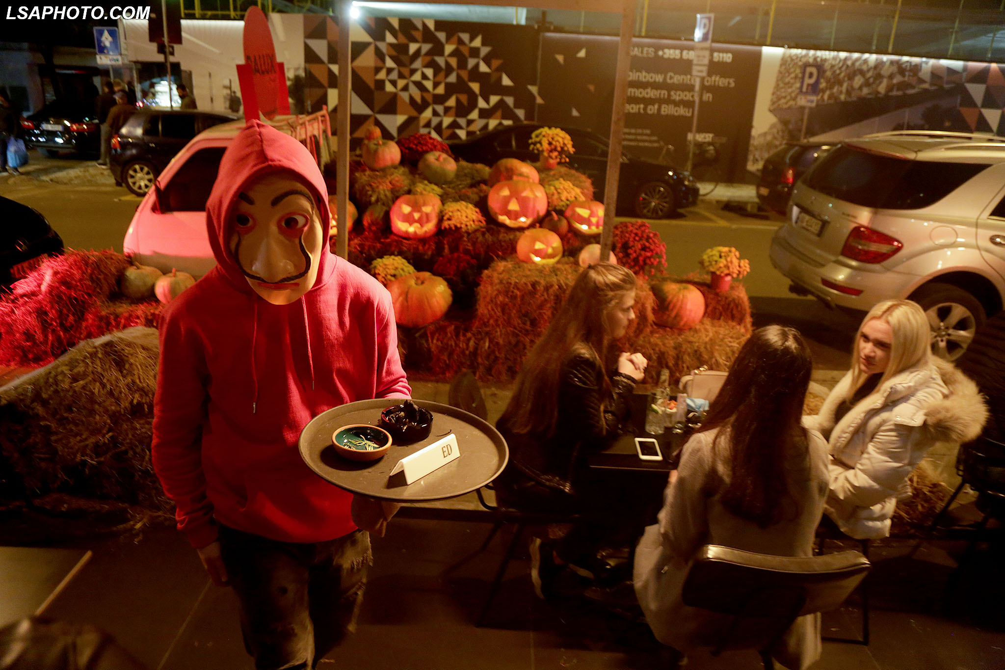Të rinj me maska të pikturuara në fytyrë gjatë festimeve me rastin e festës së Halloëeen, në një nga lokalet e Tiranës. Ndërkohë, policia ka marrë masa për të mos lejuar organizimet dhe grumbullimet për festën, për shkak të pandemisë së koronavirusit.