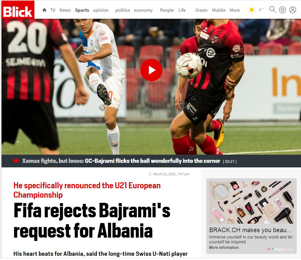 “Blick” raporton së fundmi, se FIFA nuk e ka pranuar kërkesën që Bajrami të luajë me Shqipërinë në të ardhmen. E gjitha lidhet me faktin se 22-vjeçari, ka luajtur në 4 ndeshje me Zvicrën e U-21 dhe rregullorja e thotë se në rast se një lojtar pasi mbush 21 vjeç, luan me një kombëtare 1 ose më shumë ndeshje, qoftë ajo edhe e 21-vjeçarëve, atëherë nuk mund të ndryshojë kombëtaren dhe të luajë me një tjetër. Tashmë pritet një përgjigje për këtë situatë nga FSHF dhe Bajrami, por për momentin duket se neni në fjalë pengon futbollistin të veshë fanellën kuqezi dhe pritet një betejë e mirëfilltë ligjore me FIFA-n për të ndryshuar përfaqësuesen.