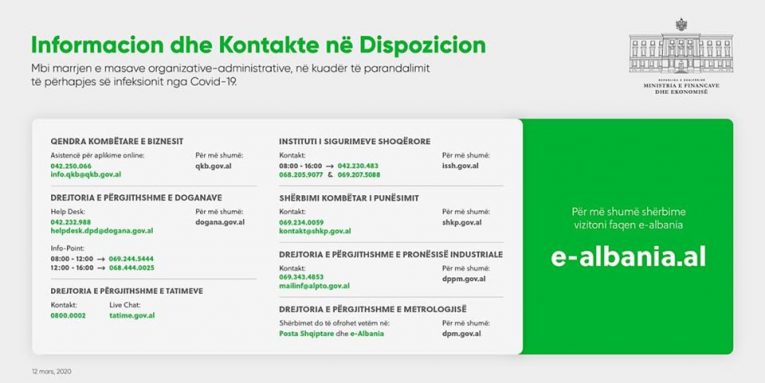 “Drejtohuni te numrat e telefonit dhe tek adresat elektronike për më shumë asistencë. Shëndeti i pari!” citon Ministria e Financave.