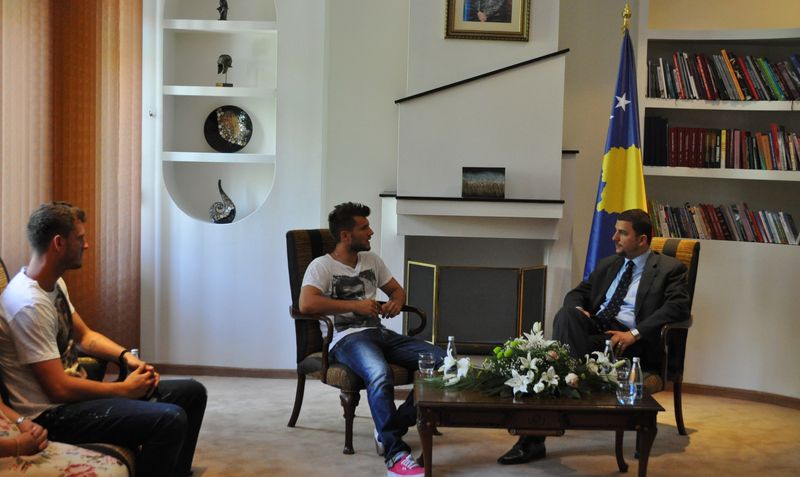 Ministri Krasniqi priti në një takim futbollistët kosovarë, vëllezërit Përparim dhe Mehmet Hetemaj, (2012)