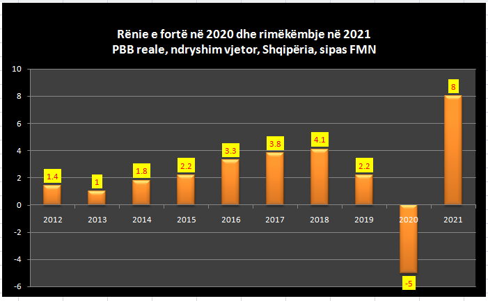 Ky parashikim është shumë më i ulët se ai i Pasqyrës Ekonomike Globale të Tetorit 2019, ku ekonomia shqiptare pritej të rimëkëmbej në 4%, nga 3% në 2019-n. Por që atëherë kanë ndodhur dy zhvillime të rëndësishme, që i kanë kthyer përmbys projeksionet: fillimisht tërmeti i 26 nëntorit, që e çoi rritjen ekonomike në negative në tremujorin e katërt të 2019-s dhe më pas kriza e paprecendentë që ka shkaktuar përhapja e infeksionit të Covid-19 dhe masat e qeverisë për ta frenuar atë.
