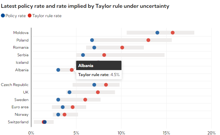 Në një grafik FMN tregon se norma Taylor 4.5% (quajtur sipas ekonomistit që e krijoi atë) për Shqipërinë, përputhet me rritjen ekonomike të vendit. Sipas FMN-së, norma momentale prej 2.9% në Shqipëri është shumë e ulët.