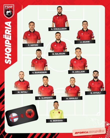 Kristjan Asllani e nis titullar transfertën me Ishujt Faroe, duke marrë vendin e Bares. Përkrah lojtarit të Interit luan Ramadani. Në sulm, Seferi ka marrë vendin e Uzunit, që sot e nis ndeshjen nga stoli. Pjesa tjetër e sulmit është po ajo, me Cikalleshin në majë, Bajramin pas dhe Asanin djathtas.