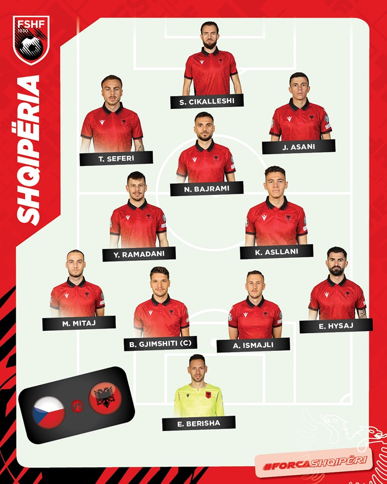 Gazeta Si – Sapo janë publikuar formacionet zyrtare të ndeshjes Çeki-Shqipëri, që nis pas pak në Pragë. Trajneri Silvinjo ka bërë zgjedhjet e tij për këtë sfidë të rëndësishme, duke iu përshtatur kundërshtarit.