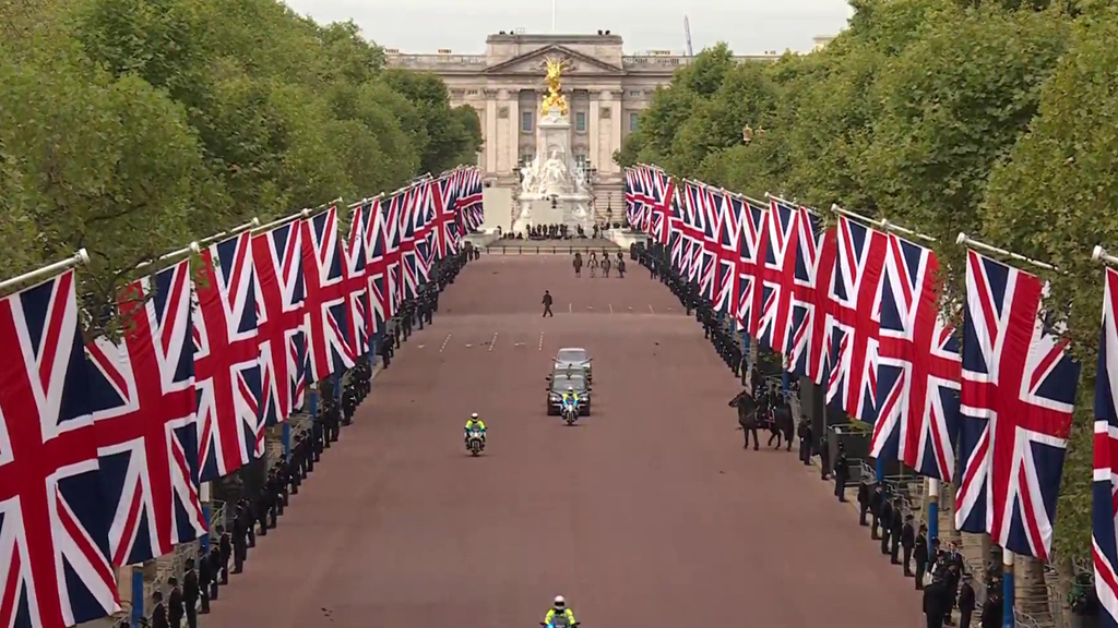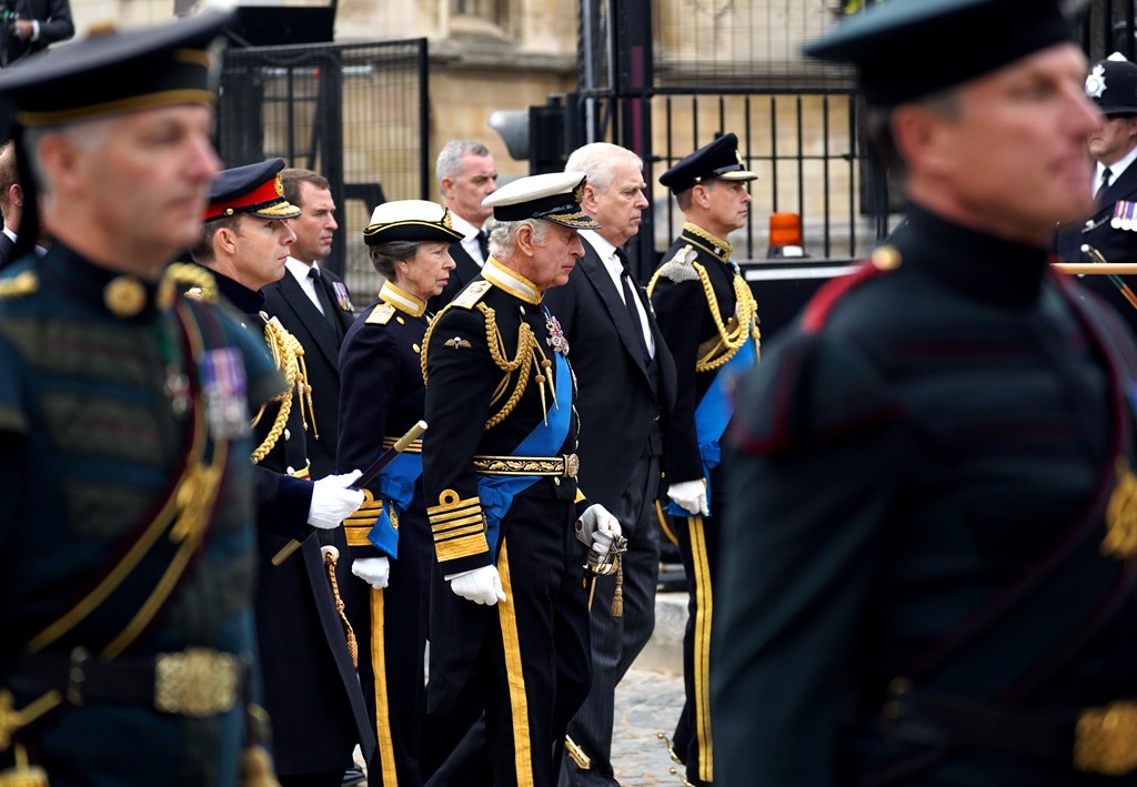 Më tej në 10:44, kortezhi i parë i ditës u nis me mbretin Charles dhe anëtarët e tjerë mbretërorë që ecën pas arkivolit të Mbretëreshës ndërsa tërhiqet nga marinarët në karrocën e armëve shtetërore nga Salla e Westminsterit në Westminster Abbey