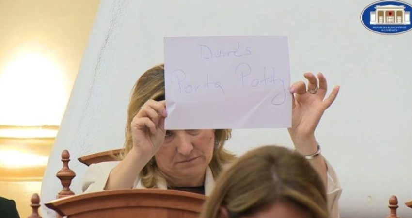 Nga vendi i saj në ulësen e Parlamentit, Açka ka nxjerrë një fletë të bardhë A4, ku shkruan me shkrim dore “Durrës Porta Potty”.