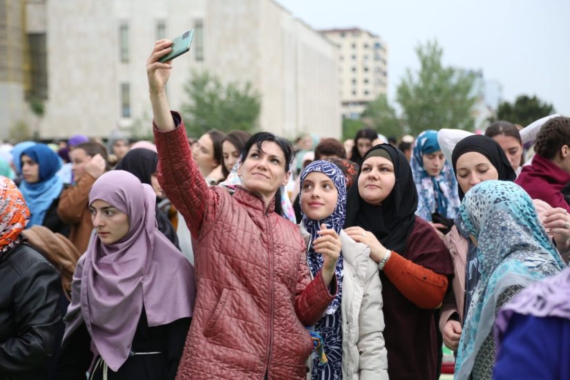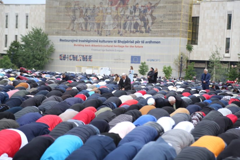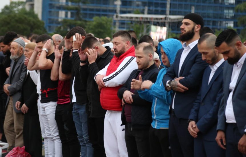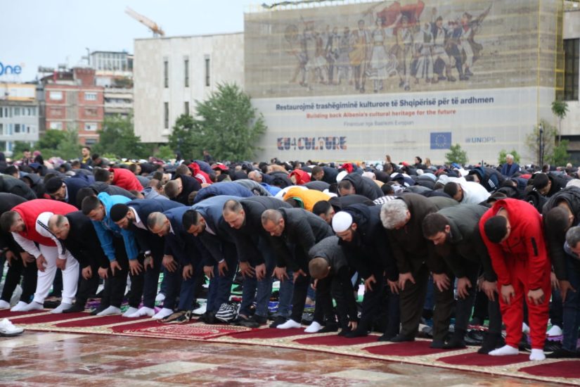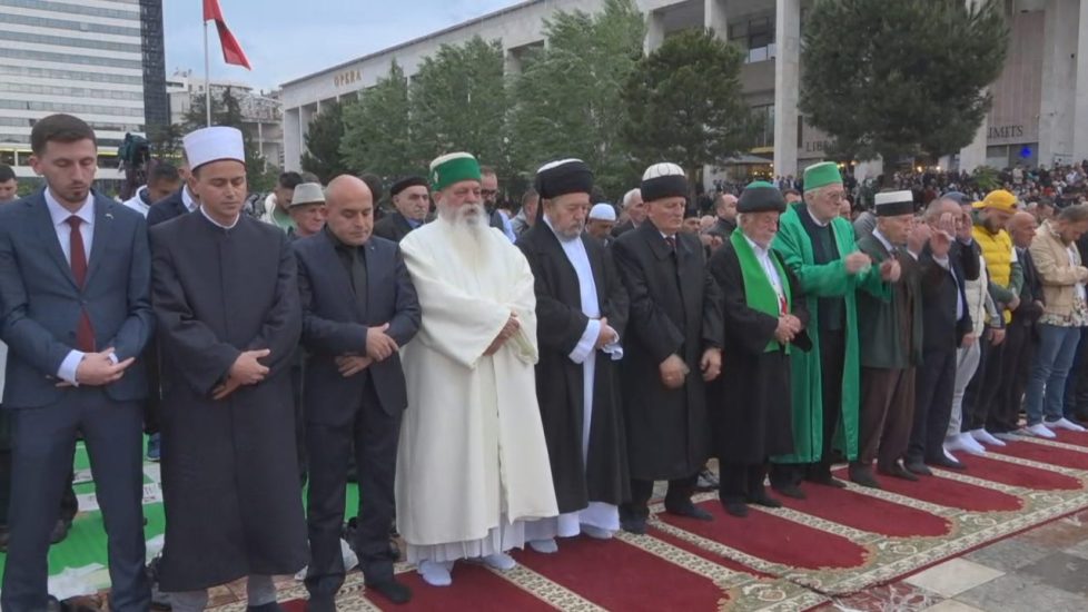 Gazeta Si – Mijëra besimtarë myslimanë kanë falur mëngjesin e të hënës namazin e Fitër Bajramit në sheshin ‘Skëndërbej’.