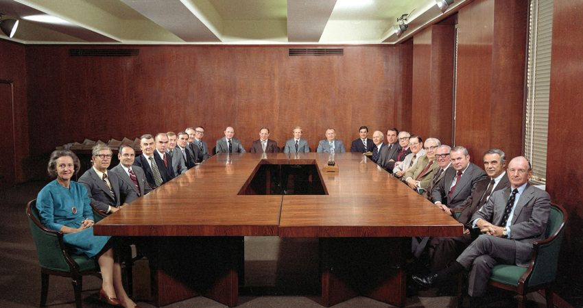 E shkrepur në qytetin e Nju Jorkut në vitin 1975, portreti i ish-botueses dhe CEO-së eventuale të Washington Post, Katharine Graham, është vetëm një nga imazhet e panumërta që ndjekin një formulë të ngjashme vizuale: e vetmja grua në një numër burrash.