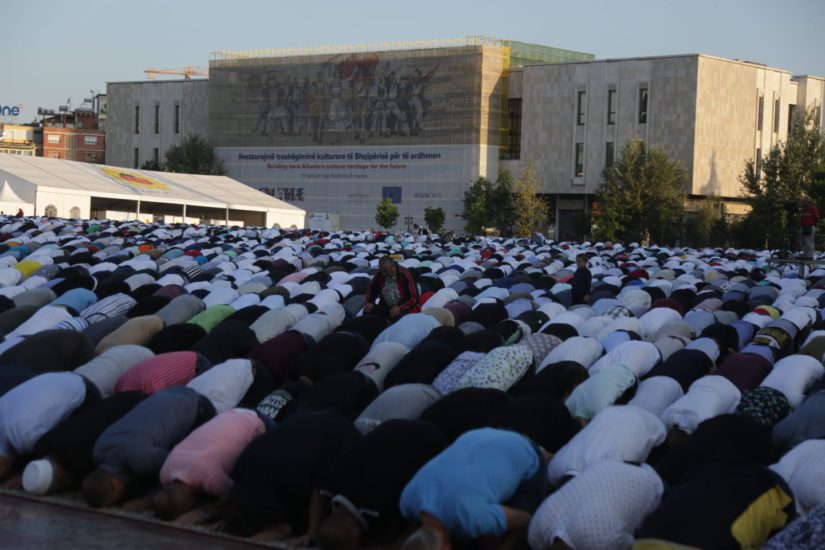 Që herët në mëngjes, mijëra besimtarë ndryshe nga një vit më parë që për shkak të pandemisë faljen e namazit të Kurban Bajramit e kanë bërë në xhami nën masat kufizuese, këtë të martë ato kane falur namazin në sheshin Skëndërbej.