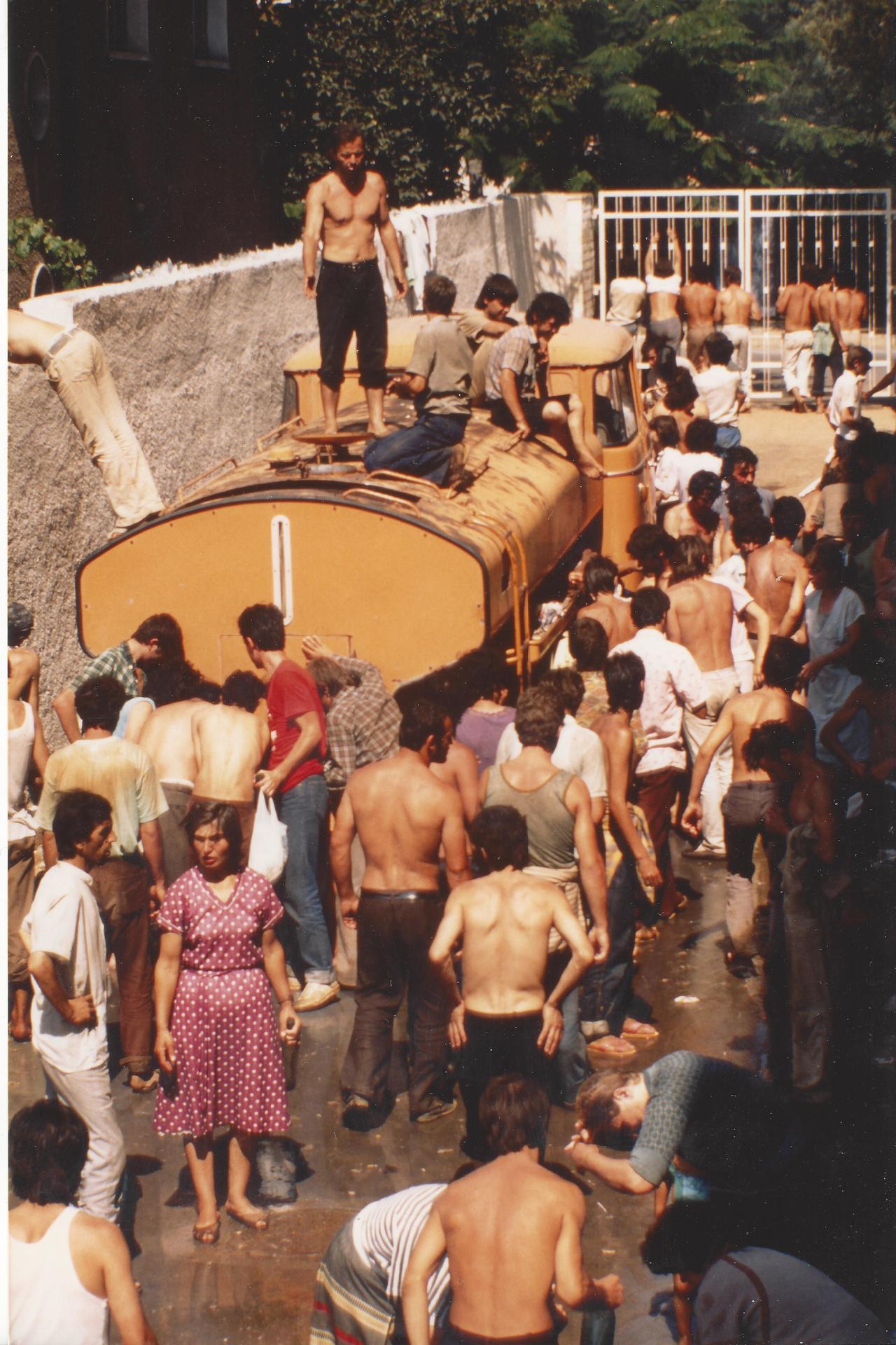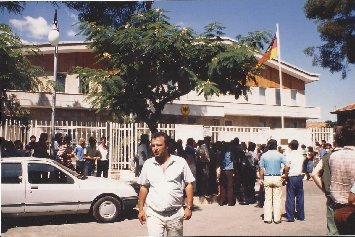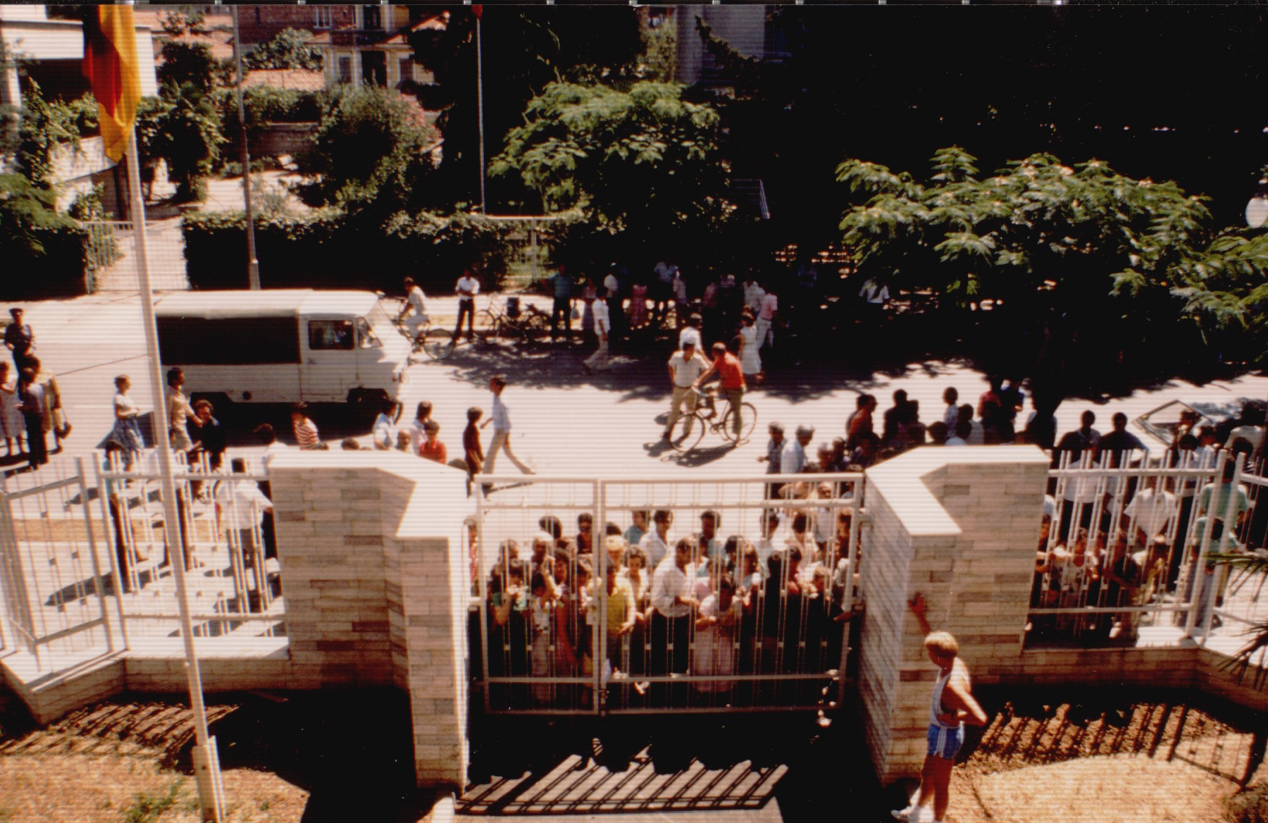 Fotogaleri tregon edhe xhipat dhe automjetet e Sigurimit të Shtetit, që vazhdimisht u bëri thirrje qytetarëve që kishin kërkuar shpëtim në Ambasadën Gjermane, që të dilnin prej andej dhe të përballeshin me akuzat e ngritura nga regjimi.