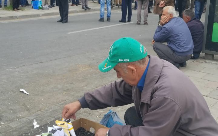 Ndërkohë që mbështetësit e Partisë Demokratike dhe ata të Lëvizjes Socialiste për Integrim janë mbledhur në protestën e radhës para Parlamentit, njerëz të tjerë vijojnë ritmin e punës normalisht. Në këto foto të shkrepura në rrugën përballë Parlamentit shohim dy të moshuar që shesin fara, duke mos u ndikuar nga protesta, por duke shpresuar se sot do të kenë më shumë klientë.