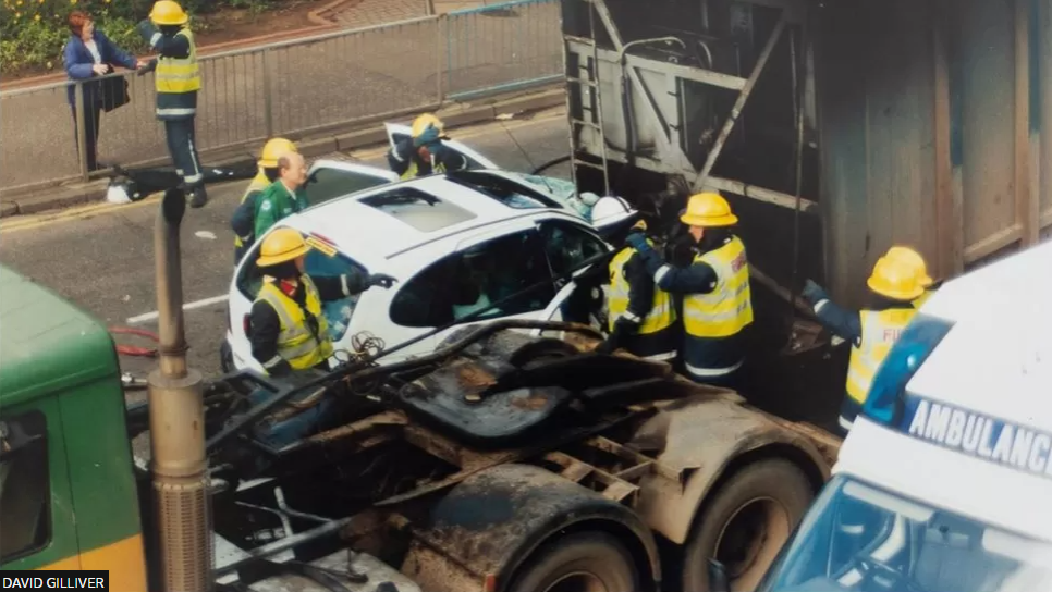 Gilliver tha se po shikonte nga dritarja kur pa një kamion në rrugë që u përmbys dhe ra sipër një makine.