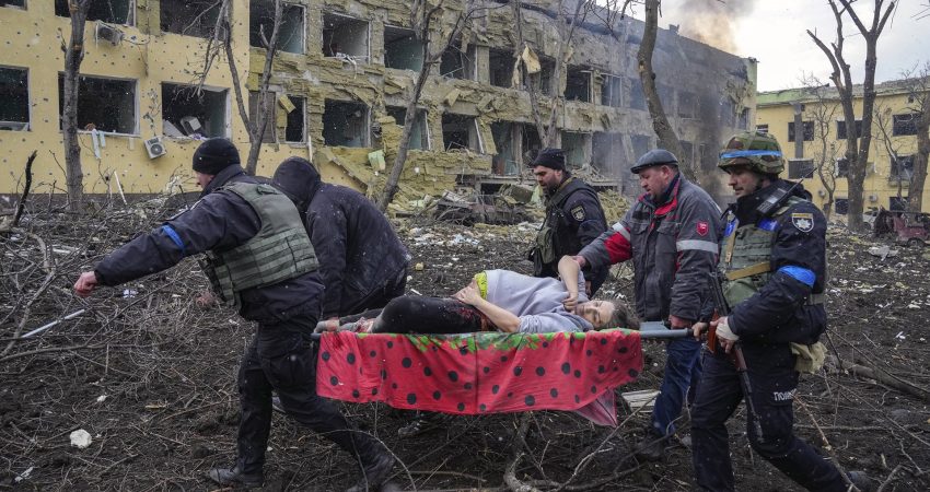 Ajo tregon një grua të plagosur dhe shtatzënë të rëndë duke u transportuar me barelë nga një maternitet i bombarduar.