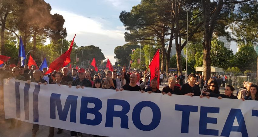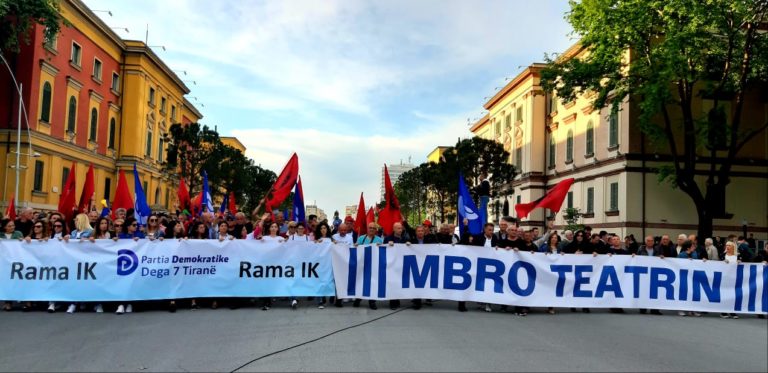 Në protestën e opozitës para Kryeministrisë është shfaqur një pankartë gjigande “Mbro Teatrin” e cila sipas informacioneve i përket Aleancës për Mbrojtjen e Teatrit Kombëtar.