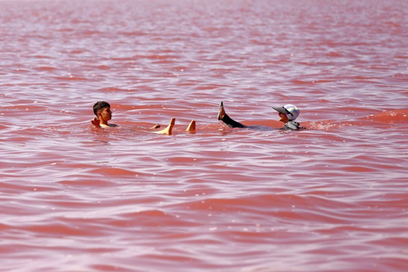 Njerëz në liqenin Urmia në Iran, një ndër më të kripurit në botë