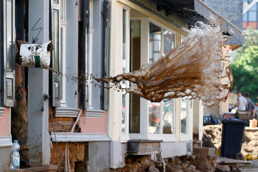 Një ushtar nxjerr ujin me kovë pas përmbytjeve në Gjermani
