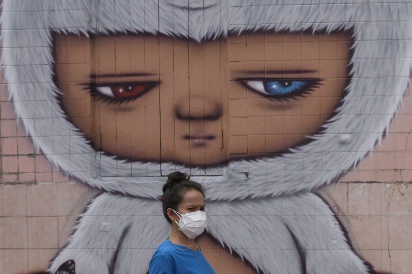 Një grua me maskë që kalon pranë një pikture në mur në Tajlandë