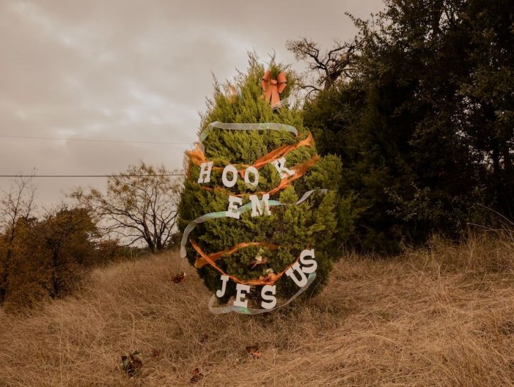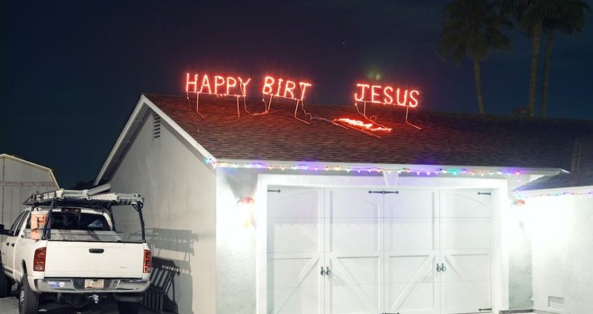 Titulli i projektit, “Krishtlindjet në Amerikë: Gëzuar ditëlindjen, Jezus”, e ka origjinën nga një nga fotot e preferuara të Rieser. Dritat e kuqe neoni shkruajnë “Happy Birt, Jesus” mbi çatinë e një garazhi të bardhë, me katër shkronjat që mungojnë të vendosura mbi herpesin.