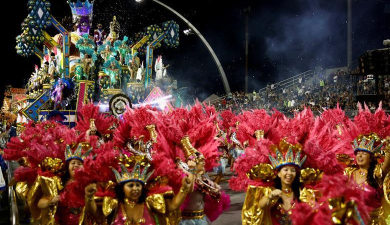 Revelers nga shkolla samba Academicos do Tucuruvi performojnë gjatë natës së parë të paradës së Karnavalit në Sambadrome Anhembi në Sao Paulo, Brazil, prill