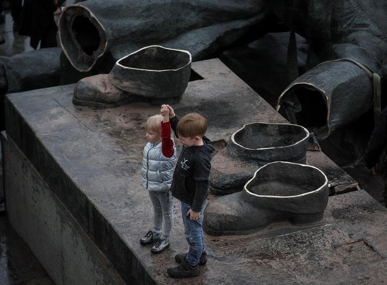 Fëmijët përshkruajnë një monument të epokës sovjetike për miqësinë midis Ukrainës dhe Rusisë, pas prishjes së tij në qendër të Kievit, Ukrainë, më 26 prill.