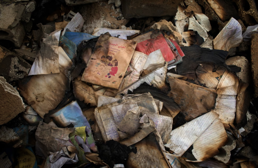 Qindra tekste shkollore të djegura nga ekstremistët e ISIS-it brenda shkollës së Hani Hakuf-it. Të paktën një e katërta e shkollave siriane janë dëmtuar ose shkatërruar.