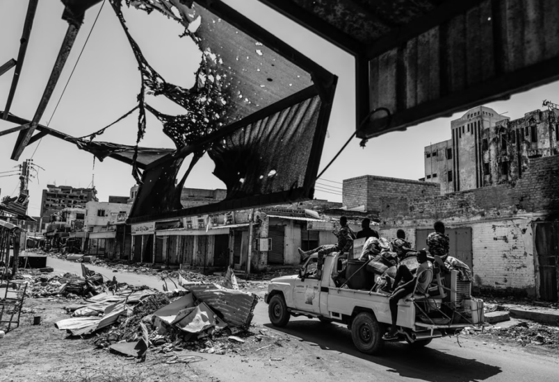 Ushtarët kalojnë nëpër një treg të dëmtuar në qytetin e dytë më të populluar të Sudanit, një vend luftimesh të vazhdueshme që nga prilli i vitit 2023.