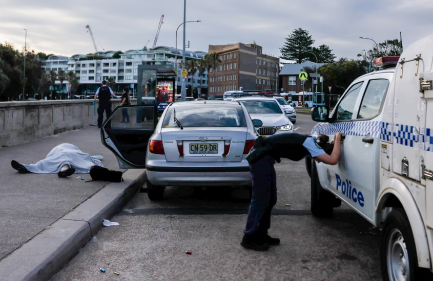 Një oficer policie i tronditur përkulet pranë trupave të Boris dhe Sofia Gurman. Gjatë sulmit terrorist në Bondi Beach, Australi, çifti u vra ndërsa përpiqej të çarmatosë njërin prej autorëve të sulmit.