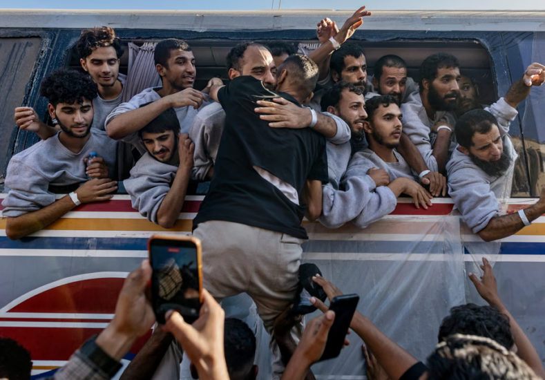 Të paraburgosurit dhe të burgosurit palestinezë mbërrijnë në spitalin Nasser pasi u liruan nga paraburgimi izraelit si pjesë e marrëveshjes së armëpushimit. Izraeli liroi gati 2,000 palestinezë.