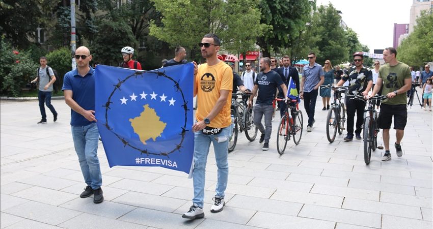 Ata dolën për të protestuar me biçikleta, duke mbajtur në duar flamurin e Kosovës, i rrethuar me tela me gjemba, për të treguar “Kosovën e izoluar”.